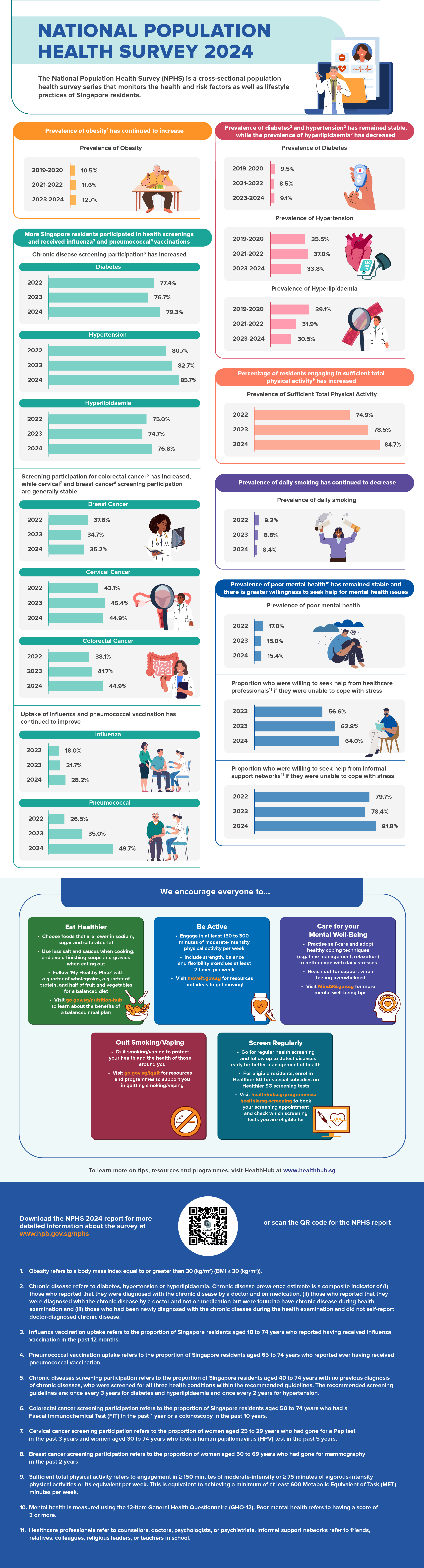 The NPHS 2024 has found that Singapore residents are adopting healthier lifestyles, with total physical activity and health screening rates rising and returning to pre-COVID levels, prevalence of daily smoking continuing to decrease to an all-time low, and a significant improvement in influenza and pneumococcal vaccination rates. The prevalence of diabetes and hypertension remains stable, while that for hyperlipidaemia has decreased over the years. That said, these chronic diseases remain a concern as prevalence rates are high, with about 1 in 3 Singapore residents continue to have hyperlipidaemia and hypertension. There is also a need to sustain efforts to address the significant increase in prevalence of obesity (BMI ≥30.0 kg/m2). While mental health challenges remain most prevalent among younger adults aged 18 to 29 years, Singapore residents have shown greater willingness to seek help for mental health concerns